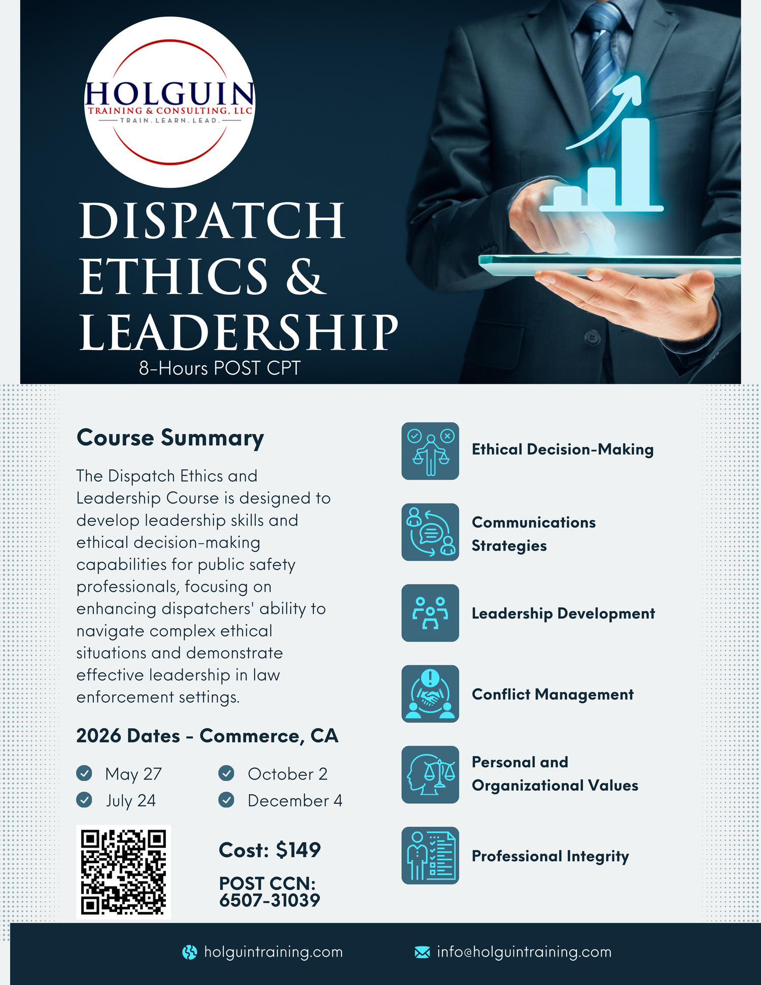 Holguin Training & Consulting, LLC provides specialized training and consulting services for emergency dispatchers, law enforcement, private security, and private companies. Founded by industry experts, HTAC is committed to helping professionals enhance their strategic communication, leadership, and crisis management skills.